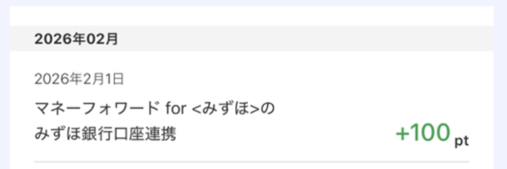 | マネーフォワード(みずほ)でみずほ銀行口座連携 | 連携した月の翌々月 1日 | 100pt |
