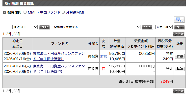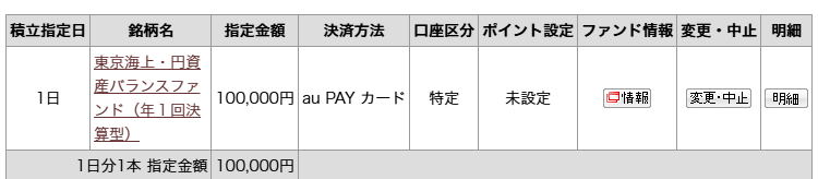クレジットカード積立で東京海上・円資産バランスファンド年1回決算型を毎月、10万積立設定します。
