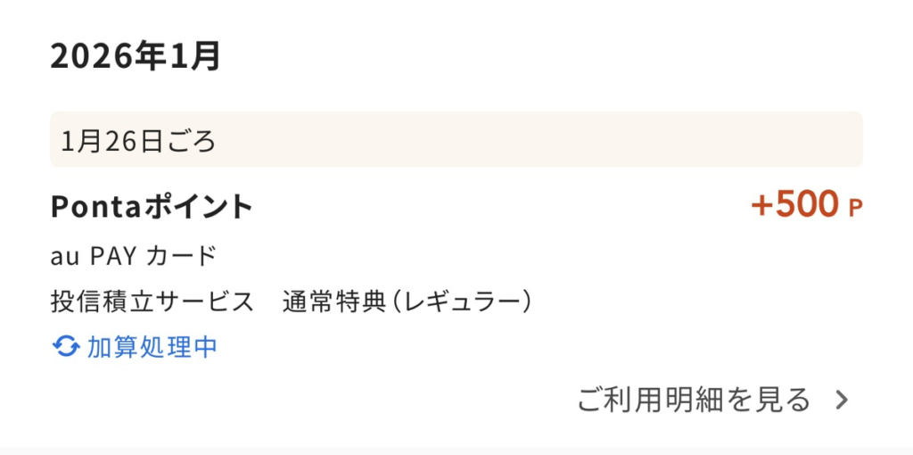 約定後、積立が約定した月の中旬〜月末頃に500ポイントが付与されます。