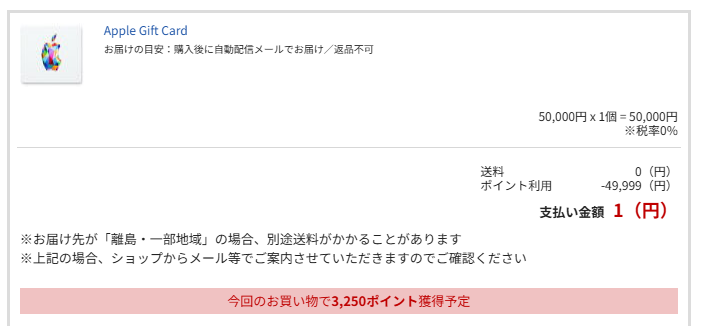 あとは楽天キャッシュを全額使って(1円だけクレジットカード払いにする必要あり)、Apple Gift Cardを買うだけです。