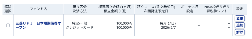 クレジットカード積立で三菱UFJ 日本短期債券オープン(円債ファースト)を毎月、10万積立設定します。